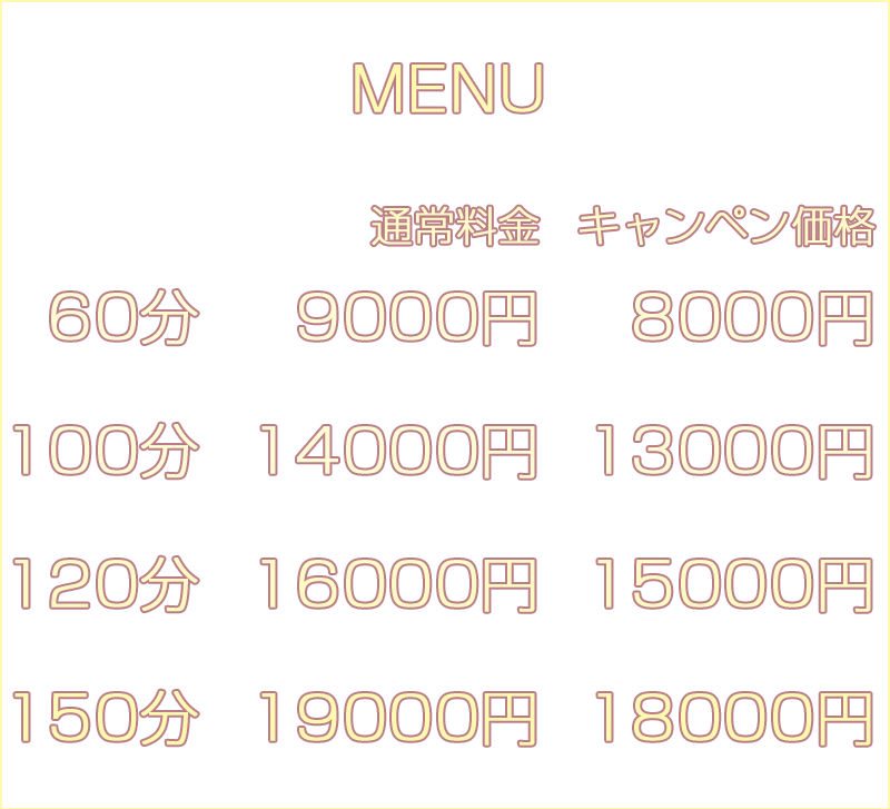 | 待 遇: | 完全全額日払い制 優しく笑顔でお客様に接客できる方、おしゃべりが好きな方。 出勤後に一時外出することもできます。 指圧整体等の経験者は優遇させていただきます。 |